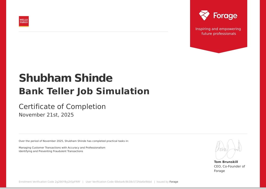 Completed Certification of Bank Teller Job Simulation from Wells Fargo!