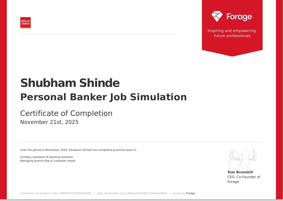 Completed Certification of Personal Banker Job Simulation from Wells Fargo!